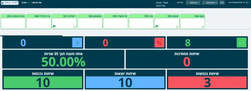 - דשבורד בזמן אמת – שיחות פעילות, סטטיסטיקות נציגים, תורים פעילים